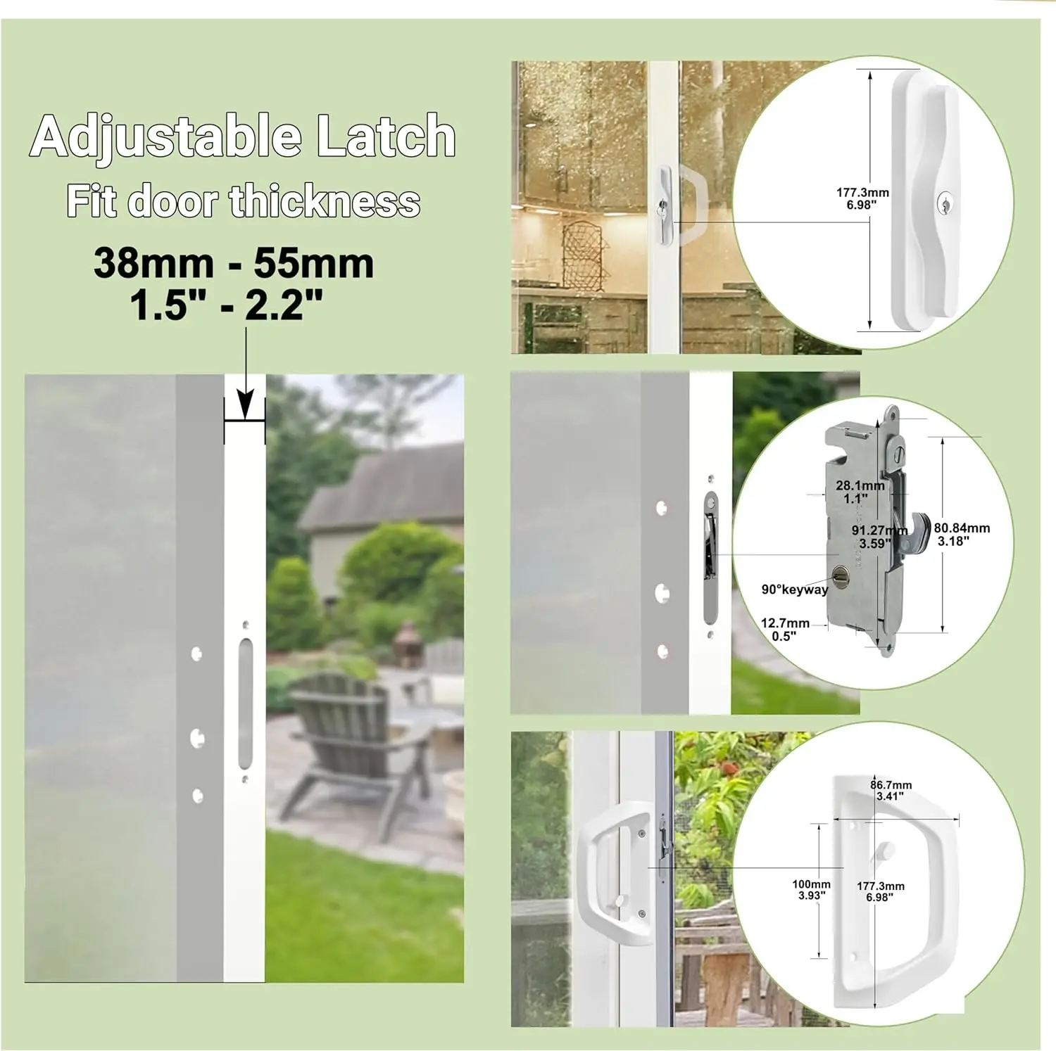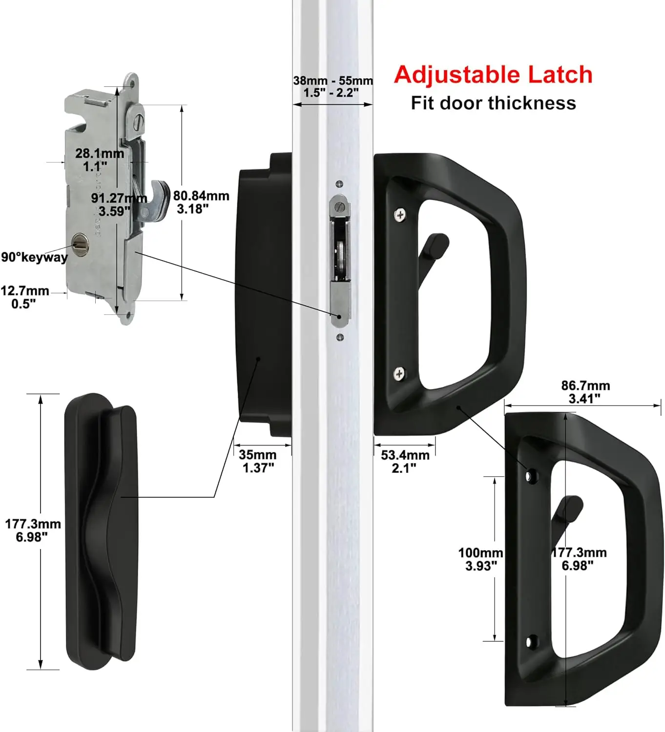Our lock set is designed to fit a wide range of door thicknesses, from 1-1/2 inches to 2-4/25 inches. We’ve included 3 different screw sizes for added convenience. Additionally, our upgraded 90° mortise lock ensures effortless locking and unlocking. Please note that our patio door lock only works with our 90° Key ways mortise. The thumb latch cannot be used with other locks.