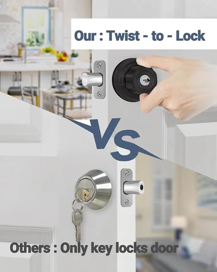 The Twist-to-lock feature gives you choices: You can ask guys to lock the door when you leave. If you worry about being locked out for a certain period of time, just press the anti.Mislock Button on the exterior knob, and use the key to get in. If have an elderly person, a hands full situation, or if children use the door just unlock the Anti-Mislock feature.